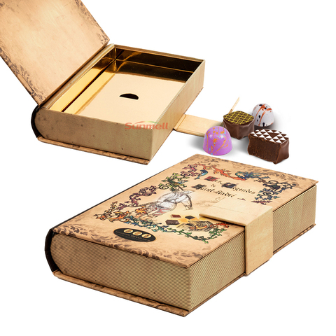 Benutzer definierte leere Schokoladen box Hochwertige Papp buchform Schokoladen boxen mit Papier teilern